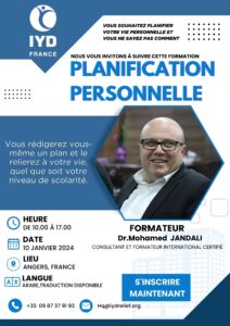 Dans le cadre de ses activités de développement personnel et de soutien communautaire, IYD France a organisé le 10 janvier 2024, dans ses bureaux à Angers, une formation intitulée “Planification Personnelle”, animée par le Dr Mohamad Jandali, consultant et formateur international certifié.